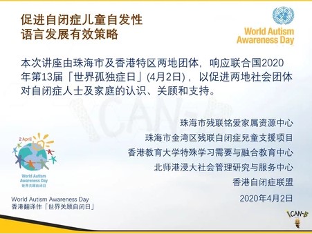 ICan-B Asia 的王博士應邀在「世界關顧自閉日」作題為 「促進自閉症兒童自發性 語言發展有效策略」的演講。 很榮幸能受邀在這一有意義的日子做演講,並有機會與珠海的許多父母和老師見面!